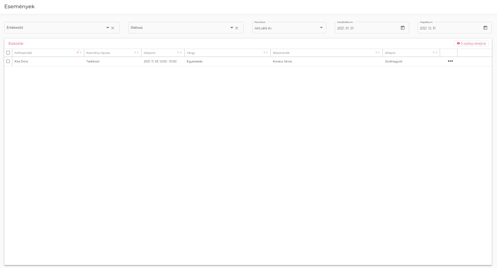 Az ilyen események Rögzített állapottal kerülnek ebbe a listába. Ez után a CRM Modulvezető a hárompontos menüből indítva jóváhagyhatja vagy elutasíthatja (rendre Jóváhagyott vagy Elutasított állapotba kerül az esemény).