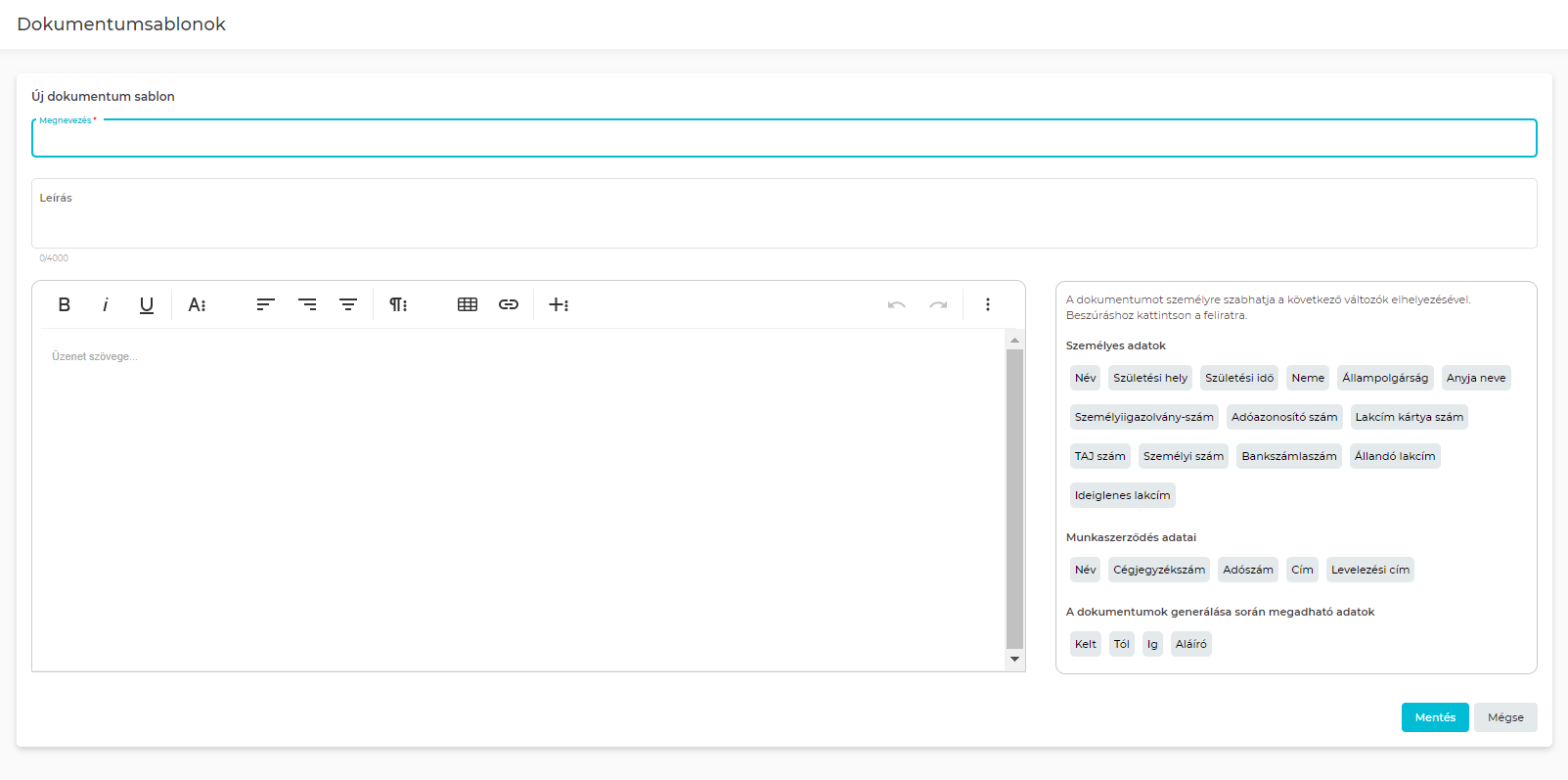 A sablon szerkesztéséhez a változókat a szövegszerkesztő melletti kártyán találja, egyszeri rákattintással illesztheti a szövegbe az adott változót.