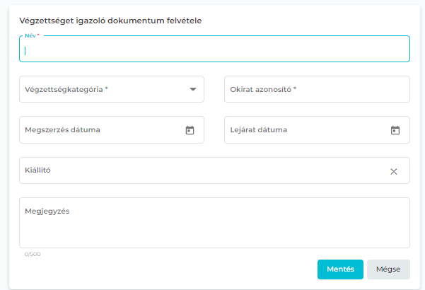 Ne feledje: A Végzettségkategória listájából azon értékek választhatók, melyeket korábban a HR Modulvezető vagy a HR Asszisztens a Beállítások > Alapbeállítások menüben a Végzettségkategóriák kártyára felvett.