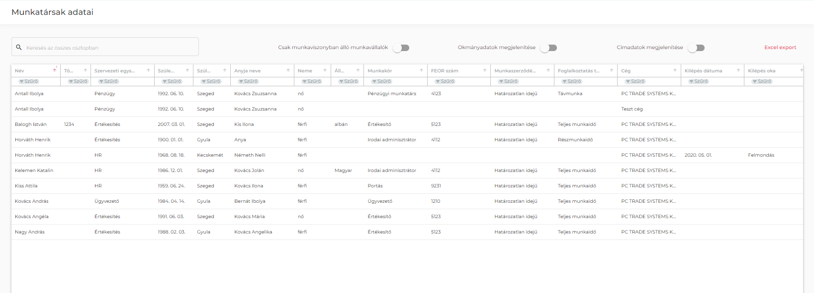 A táblázat felett található szabadszavas keresővel a táblázat összes adatára lehet keresni. A Csak munkaviszonyban álló munkavállalókra szűrni lehet az azonos nevű kapcsolóval, valamint bővíthető a táblázat az Okmányadatok megjelenítése és a Címadatok megjelenítése kapcsolók segítéségével. A táblázat minden oszlopa rendezhető és minden oszlopa szűrhető.