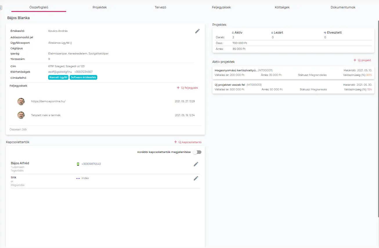 Az Összefoglaló fülön az Alapadatok, a Kapcsolattartók, a Projektek, az Aktív projektek és az Aktív események kártyái helyezkednek el.