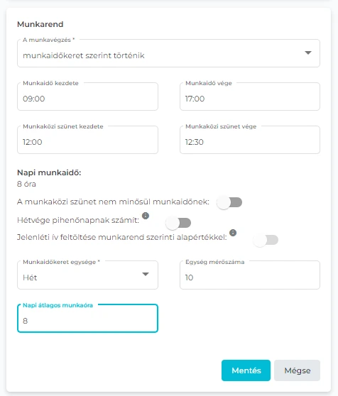 Opcionálisan (nem kötelezően) megadhatja a következő adatokat: - Munkaidő kezdete; - Munkaidő vége; - Munkaközi szünet kezdete; - Munkaközi szünet vége.
