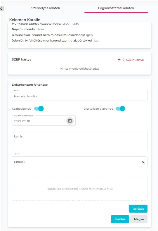 - A Munkatársak menüben adott HR Dolgozó adatlapján a Foglalkoztatási adatok fülön a Dokumentumtár kártyán +Új dokumentum gombot megnyomva, a Digitálisan kapcsoló bekapcsolásával és az aláírás határidejének megadásával és a mentés gomb megnyomásával;