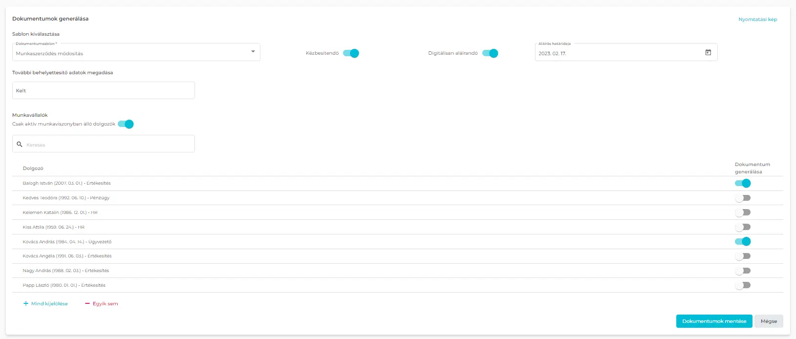 - Digitálisan aláírandó dokumentumot a HR Asszisztens és a HR Modulvezető tud tömegesen is generálni dokumentumsablon segítségével:
