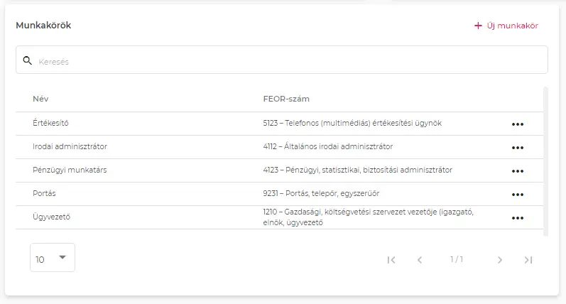 A +Új munkakör gomb megnyomásával vehet fel új munkakört a kártyára. Ekkor a munkakör nevének megadása mellett a FEOR-szám keresővel definiálnia kell a munkakört (név és szám szerint is kereshet a FEOR adatbázisból). Az itt hozzáadott munkaköröket tudja majd kiválasztani a HR Asszisztens vagy HR Modulvezető a Munkatársak menü, Foglalkoztatási adatok fülön a HR Dolgozó Munkaszerződésének és munkaköri leírásának felvételekor, illetve szerkesztésekor.